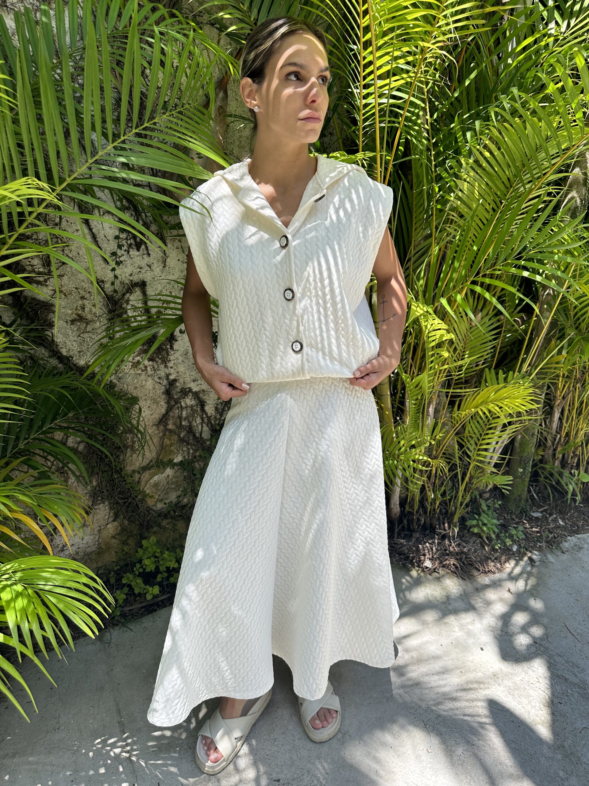 Saia off white, confeccionada em tecido de Neoprene. Muito flexível, tem como principais características a elasticidade e a durabilidade. Não amassa, não marca o corpo, secagem rápida.